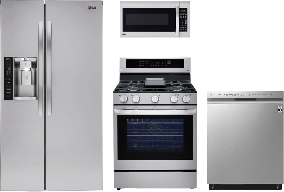 LG 4 Piece Kitchen Package-Stainless Steel with a side-by-side refrigerator, free standing gas range, built in dishwasher and over the range microwaveRead More