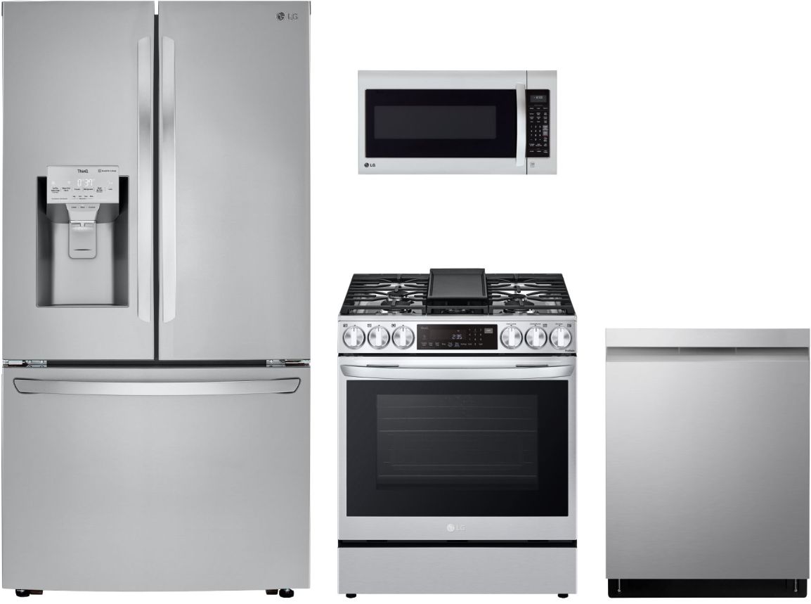 LG 4 Piece Stainless Steel Kitchen Package with french door refrigerator, silde in gas range, built in dishwasher and over the range microwaveRead More
