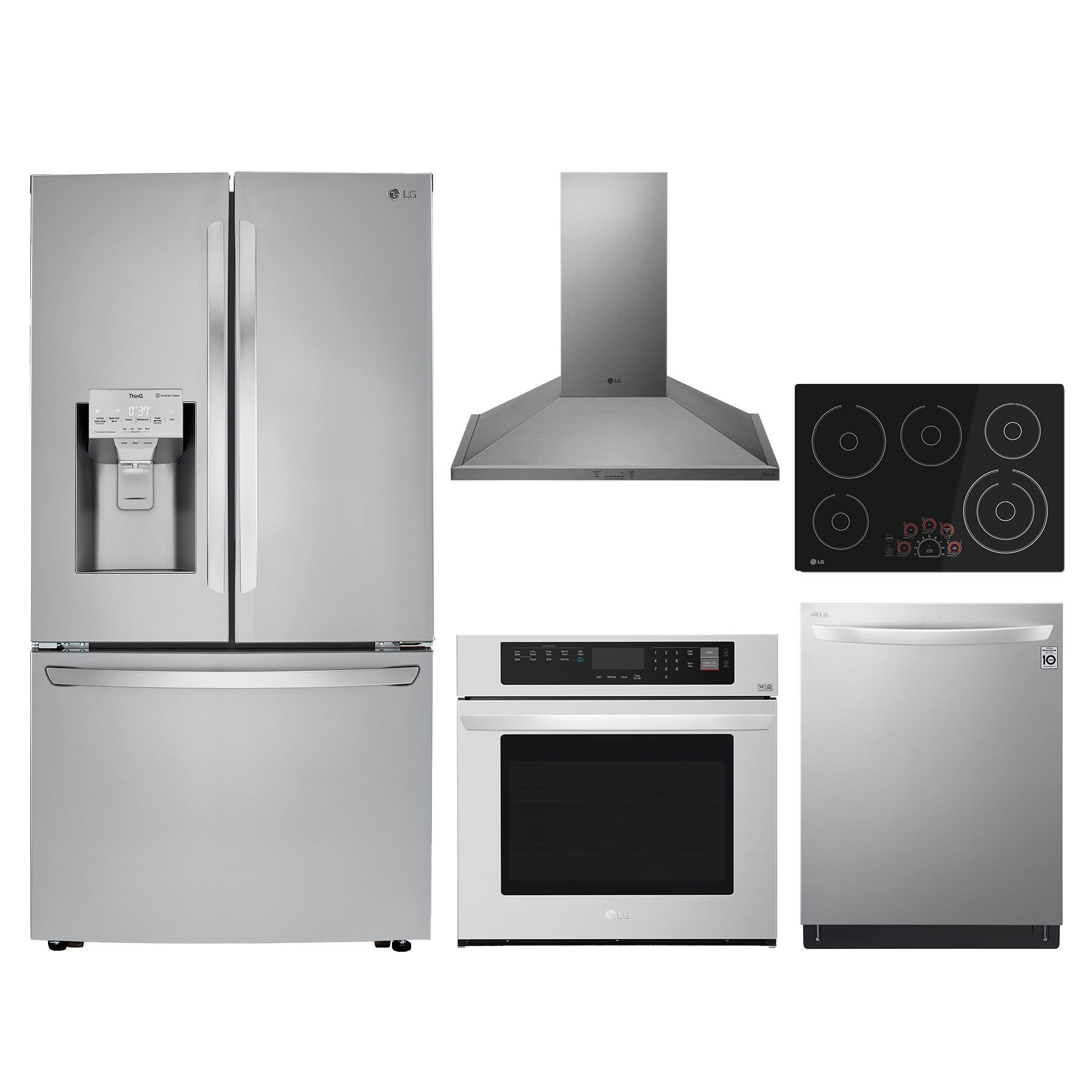 LG 5 Piece Kitchen Package with a french door refrigerator, electric cooktop, single wall oven, built in dishwasher, and range hoodRead More