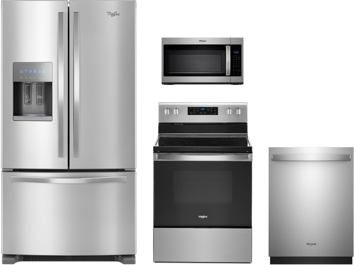 Whirlpool® 4 Piece Fingerprint Resistant Stainless Steel Kitchen Package with a french door refrigerator, over the range microwave, built in dishwasher and free standing electric range.Read More