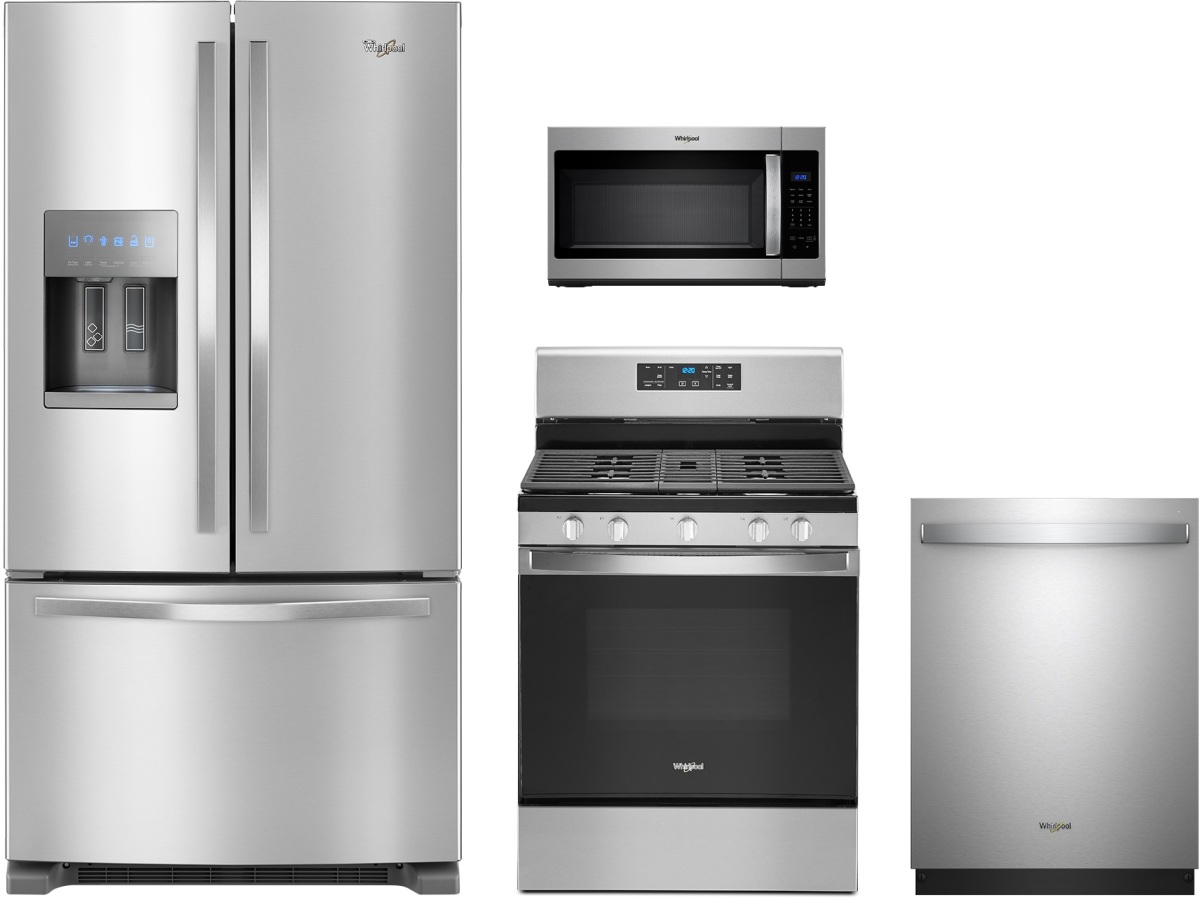 Whirlpool® 4 Piece Fingerprint Resistant Stainless Steel Kitchen Package with a french door refrigerator, over the range microwave, built in dishwasher and free standing gas range.Read More
